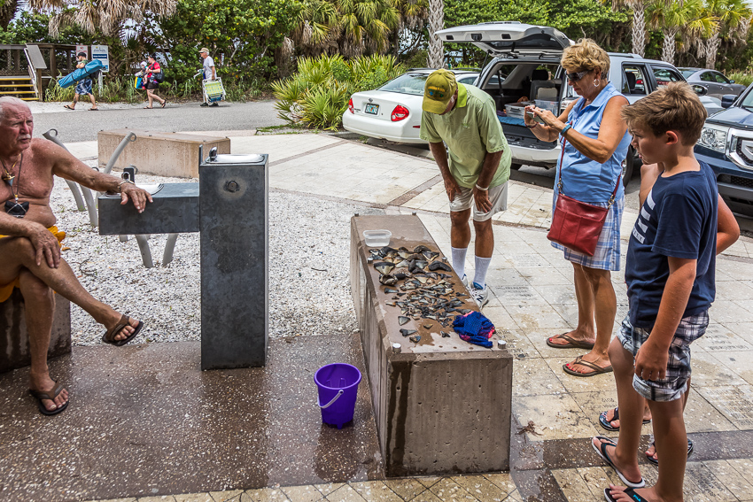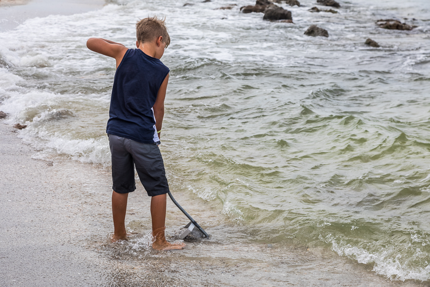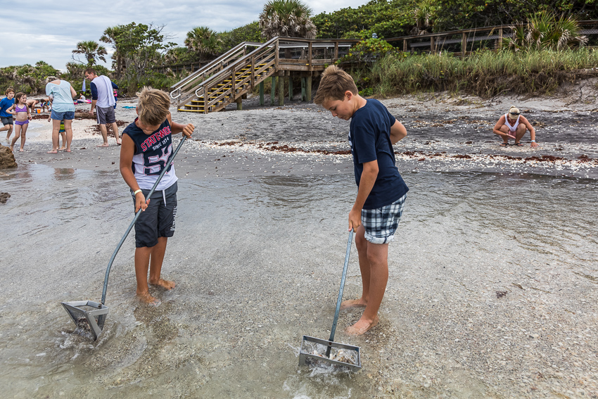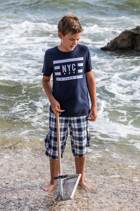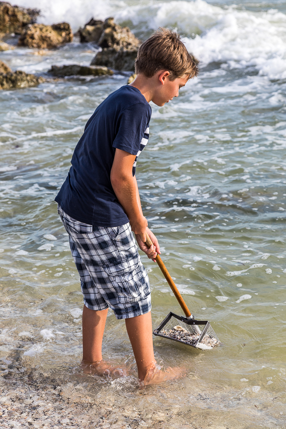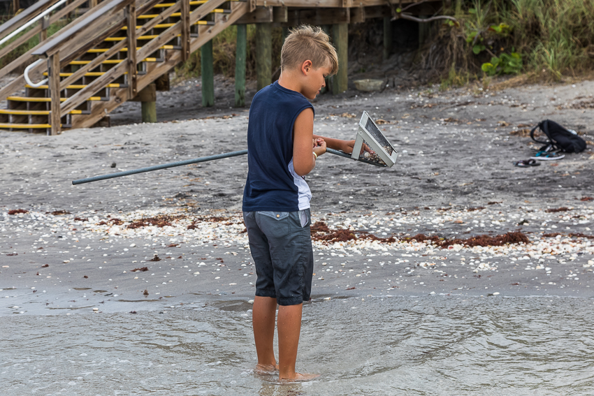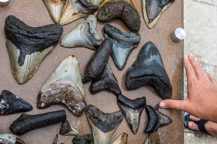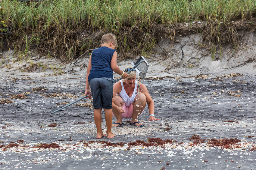 Nach kurzer Fahrt waren wir dann auch schon am Ziel. Als wir am Strand ankamen, wuselten überall Menschen mit einer Art Kescher im oder am Wasser herum. Den „Kescher“ hatten wir schon zuvor für 17$ im Walmart entdeckt, ihn aber bewußt nicht mitgenommen. Ins Gepäck hätte das Teil nicht gepasst und wegen ein paar Stunden so ein Teil zu kaufen um es dann hier zu lassen, wollten wir dann irgendwie auch nicht. Wir hatten aber Glück, da ich bereits zuvor am Parkplatz einen Ami mit seinen zwei Enkelkindern gefragt hatte, ob man denn die Haifischzähne auch ohne so ein Teil finden könne. Und just dieser nette Ami hatte für seine zwei Enkel zwei Kescher und ein „Schwimmsieb“ dabei - und einen dieser Kescher lieh er uns netterweise aus.