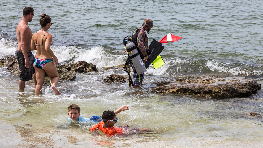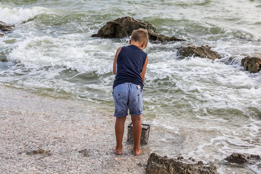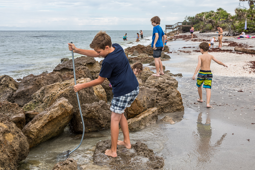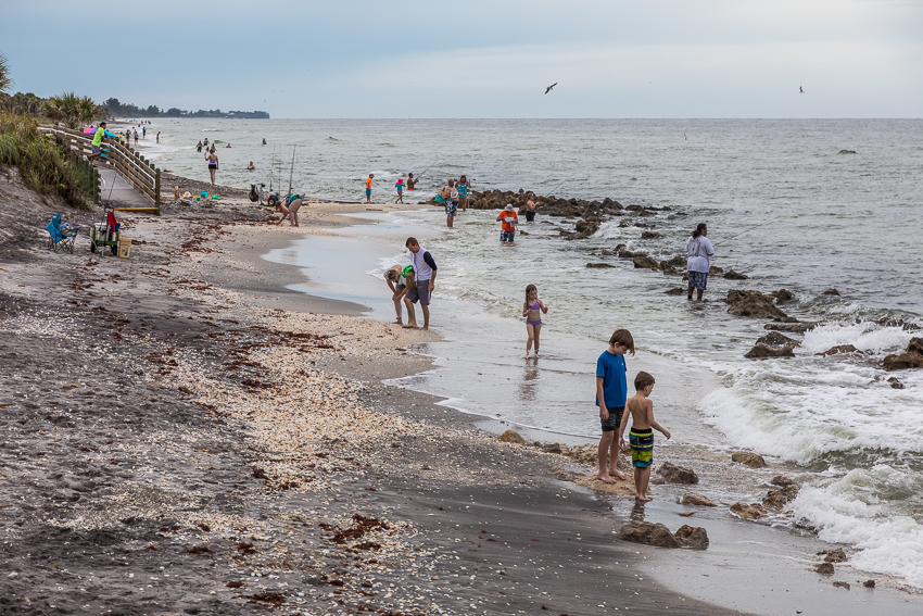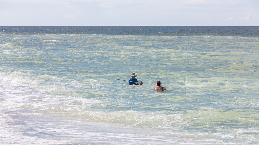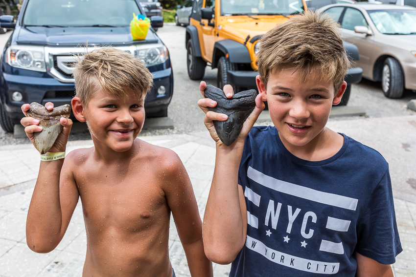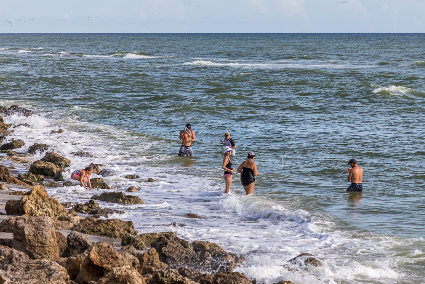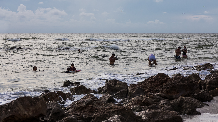 Nach kurzer Fahrt waren wir dann auch schon am Ziel. Als wir am Strand ankamen, wuselten überall Menschen mit einer Art Kescher im oder am Wasser herum. Den „Kescher“ hatten wir schon zuvor für 17$ im Walmart entdeckt, ihn aber bewußt nicht mitgenommen. Ins Gepäck hätte das Teil nicht gepasst und wegen ein paar Stunden so ein Teil zu kaufen um es dann hier zu lassen, wollten wir dann irgendwie auch nicht. Wir hatten aber Glück, da ich bereits zuvor am Parkplatz einen Ami mit seinen zwei Enkelkindern gefragt hatte, ob man denn die Haifischzähne auch ohne so ein Teil finden könne. Und just dieser nette Ami hatte für seine zwei Enkel zwei Kescher und ein „Schwimmsieb“ dabei - und einen dieser Kescher lieh er uns netterweise aus.