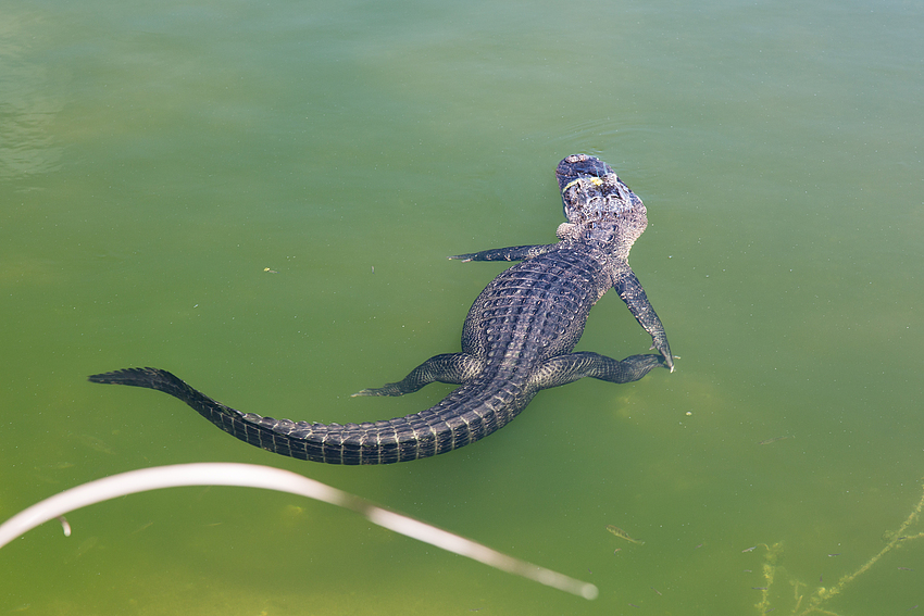 Wir sahen 2 größere Echsen, einige Schildkröten und Fische. Gerade als wir nach einer knappen halben Stunde wieder gehen wollten und uns von der Aussichtsplattform schon einige Meter entfernt hatten, rief uns ein zwischenzeitlich aufgetauchter Einheimischer noch zu, ob wir den Alligator gesehen hätten. Wir also im Stechschritt zurück, und tatsächlich: mitten im See schwamm auf einmal ein ca. 1,5 Meter langer Alligator. Er drehte gemächlich seine Runde und kam dann langsam auf uns zu geschwommen.