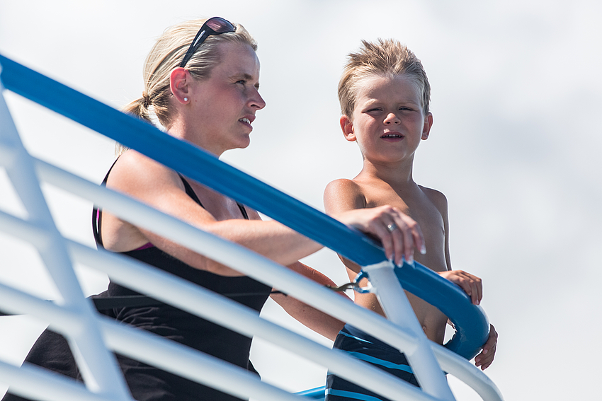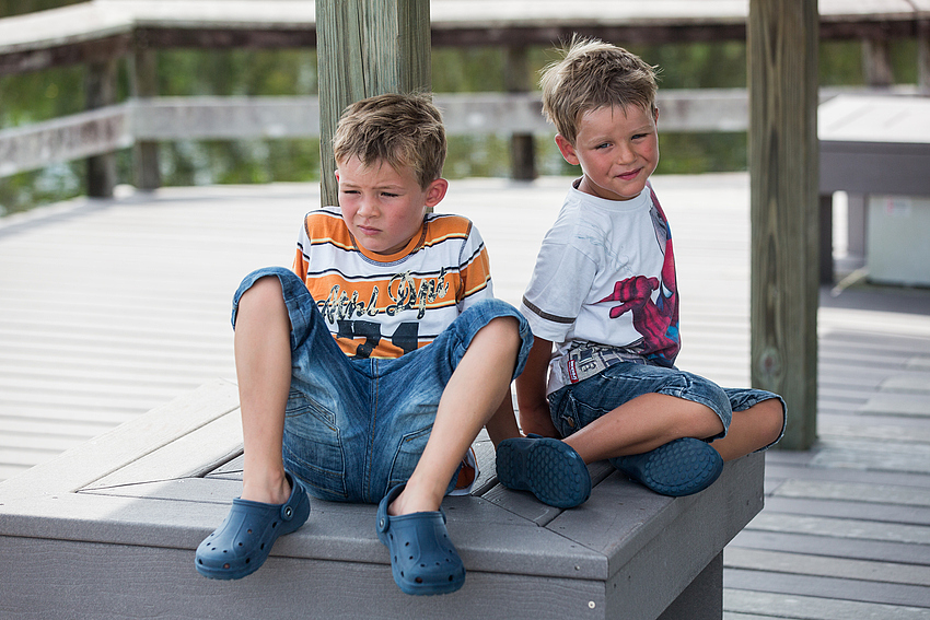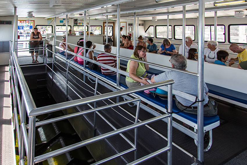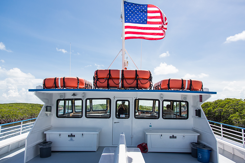 Die Fahrt war zwar erst gegen 11.00, aber um in der letzten Reihe einen Platz zu bekommen, sollte man sicherheitshalber 1 bis 1 1/2 Stunden vorher kommen. Und die letzte Reihe sollte laut Internet sowie den beiden Damen im Sanibel Thriller Office mit Abstand die Beste sein. Also nahmen wir eine etwas länger Wartezeit in Kauf, der Ride sollte ja ein besonderes Erlebnis werden und die Kids sollten entsprechend auch den besten Blick auf die Delfine haben.