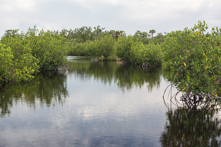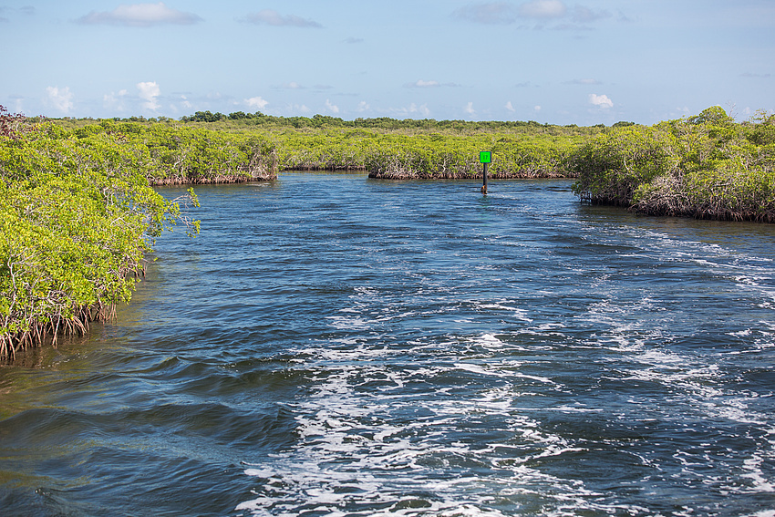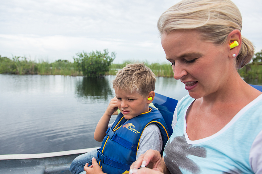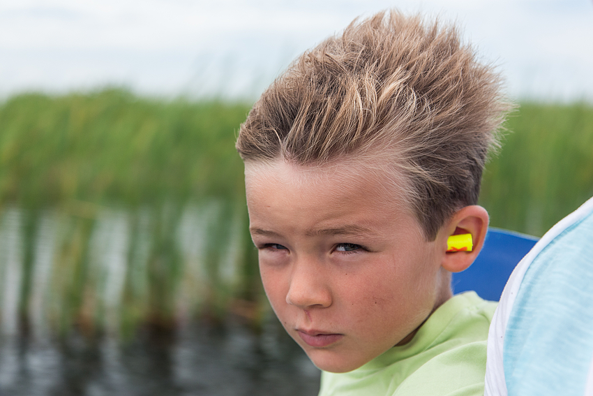 Als die 20 Minuten vorbei waren, ging es dann auch tatsächlich los. Zwischenzeitlich war noch ein weiteres Paar dazugekommen, wir waren also insgesamt 6 Passagiere an Bord. Die Ohrenstöpsel rein, Platz genommen und schon wurde der Motor angeschmissen. Los ging‘s und hoppla - nach ca. 100 Metern ging der Motor auch schon wieder aus. Wir hielten direkt an einem Mangrovenbusch, und der Captain zeigte uns ein Nest mit ca. 60 Alligator Eiern. Er klopfte mit einem Stock aufs Wasser, und nach kurzer Zeit kam auch schon die Alligatoren Mama angeschwommen.