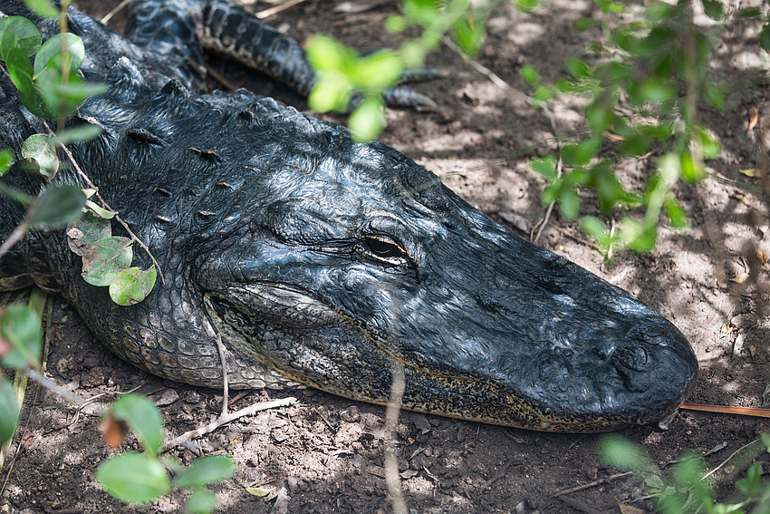 Nach 20 Minuten trollten wir uns und zahlten die 10$ Parkgebühr am Eingang des NP‘s. Als ersten Anlaufpunkt hielten wir am Royal Palm Visitor Center. Dort gab es zwei Rundwege, den Gumbo Limbo Trail und den Anhinga Trail. Wir begannen mit dem Anhinga Trail und bereits nach einigen Metern kam uns eine deutsche Familie entgegen. Diese erzählte uns, das 100m weiter direkt neben einem kleinen Steg 2 große Alligatoren im Gebüsch liegen würden. Und tatsächlich, näher ran kommt man vermutlich nicht an einen Alligator. Die Hand kurz ausgestreckt, und schwupp, wäre man selbige vermutlich auch schon los gewesen.