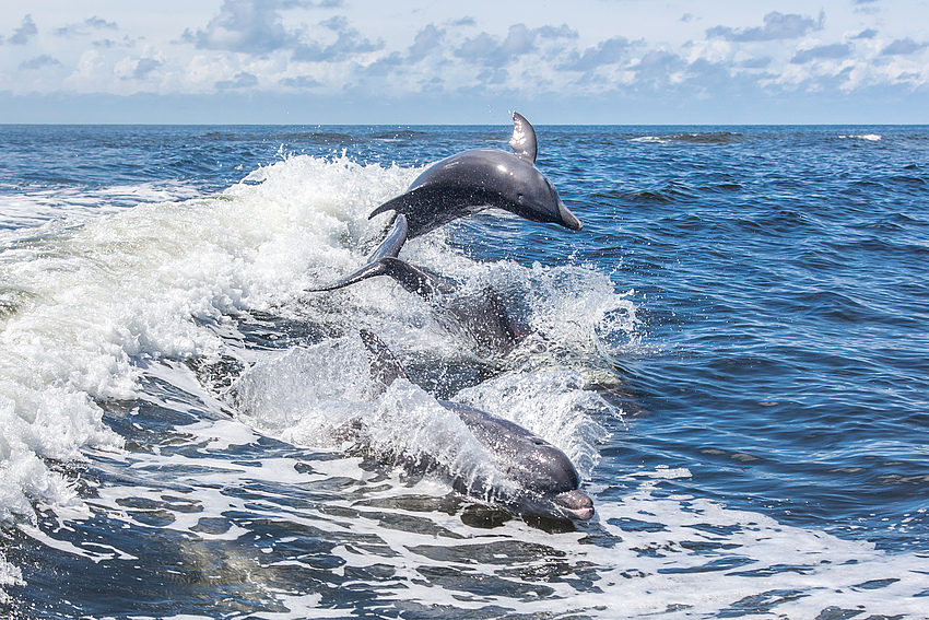 Nach ca. 20 Minuten wurden wir dann auf einmal langsamer - die ersten Delfine waren vor uns aufgetaucht. Der Captain drehte eine langsame Runde und versuchte so, die Delfine in die Heckwelle des Bootes zu locken. Dies gelang dann auch nach kurzer Zeit und es wurde wieder etwas Gas gegeben, damit die Delfine größere Wellen zum springen hatten - woow, das war schon ein einmaliger Anblick.