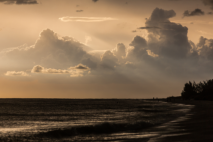 Ich checkte kurz ein, wir brachten die Koffer aufs Zimmer, zogen schnell die Badesachen an, und schon ging es die 25 Meter bis zum Strand. Der Himmel sah zum Teil recht bedrohlich aus, aber bis auf den einen oder anderen Tropfen hielt sich das Wetter.