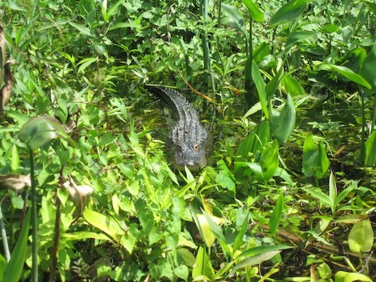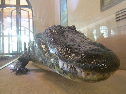 Auf der ganzen Tour gab es bestimmt 20 alligators in allen Größen zu sehen. Der Guide kennt halt die besten Plätze. Dieses Exemplar ist leider in den 60er Jahren einem Wilderer zum Opfer gefallen (den man bis heute nicht gefasst hat). Jetzt fristet er sein ausgestopftes Dasein in der Lodge des Parks.