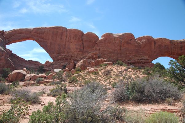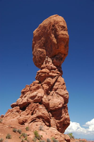 Arches Nationalpark steht heute auf dem Programm - auch für mich Neuland, mussten wir den Besuch hier 2006 doch wegen des miesen Wetters ausfallen lassen.Wir schlafen wieder bis ca. 08.00 Uhr und schaffen diesmal auch noch die leckeren Waffeln zum Frühstück. Auf der Suche nach einer Kappe für Stefan (dessen Kopfhaut schon beim Ansehen schmerzt) bleiben wir bei Moabs "hier-gibt-es-fast-alles-Laden" hängen und kaufen noch Postkarten und Buck Knifes. Um 11.00 Uhr fahren wir in den Arches NP ein und informieren uns im Visitor Center. Nach dem kleinen Infofilm, der die Entstehungsgeschichte von Canyonlands und Arches erklärt (aus dem Discovery Channel) fühlen wir uns für den Park gerüstet. Die Temperatur beträgt 100°F und der Himmel ist teilweise bewölkt. Geplant sind eigentlich nur 2 laut Forum und Prospekt leichte Trails, der Delicate und der Landscape, da wir ja nun eher unsportlich und Autotouristen sind. Die Einfahrt in den Park und die sich veränderte Landschaft sind schon spannend und sehr sehenswert. Für den Hobbyfotografen ist das Licht allerdings "zu hart". Ich schätze mal, dass wir wie fast alle den ersten Stopp beim Balanced Rock einlegen und hier das xte Foto im Forum davon erscheint -aber ich weiß auch, das hier heimliche Leser sind, die den Balanced Rock noch nicht kennen :-D *knutsch*