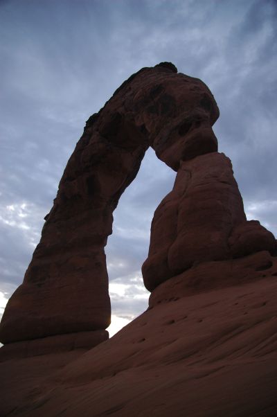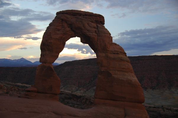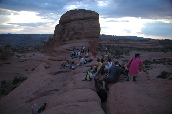 danach brechen wir den Trail aber ab und kehren um. Wir wollen ja noch Energie für den Delicate Arch haben. Nachdem wir den Rückweg hinter uns haben, dusche ich erstmal halb unter dem Wasserspender am Parkplatz, das tut richtig gut. Wir fahren zum Delicate Arch und schauen auf die Uhr, sie zeigt 17:00. Sonnenuntergang soll um 20:15 sein - wir haben also noch reichlich Zeit. Da die Beine im Moment extrem schwer sind, beschliessen wir ins Motel in Moab zu fahren, dauert ja nur 30 Miunten. Eine Stunde aussruhen und 'ne Kleinigkeit essen, dazu die Getränke auffüllen. Wir schaffen auch rechtzeitig wieder den Aufbruch und sind gegen 19:10 am Parkplatz zum Delicate Arch. Und nun beginnt der "easy trail" - das ich nicht lache. Easy ist das für jemanden, der vorher nicht schon den ganzen Tag im Park unterwegs ist.