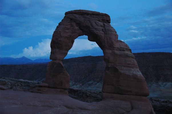 Danach setzen wir uns einfach auf den Felsen und geniessen. Der Arch ist schon etwas besonderes, so allein an der Felskante. Und der Weg hierauf lohnt nur, wenn man die Aussicht auch mal einige Minuten auf sich wirken lässt (wenn nur die ganzen lärmenden Franzosen nicht wären). Da wir keine Lampe bei uns haben, schiesse ich noch ein "blaues Foto"