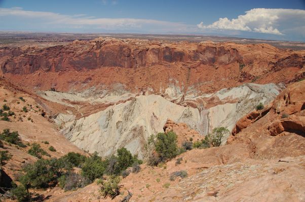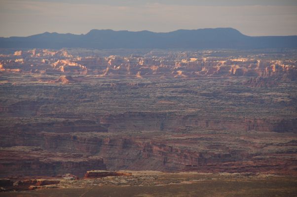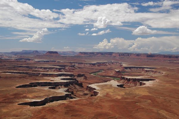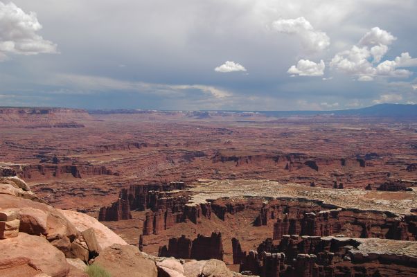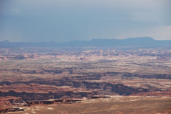 Zu Entstehung dieser Formation gibt es 2 Erklärungen. Entweder war es ein Meteorit Einschlag oder aber hier hat sich eine Salzschicht von unten gehoben und das Gestein nach oben gedrückt. Wir laufen zurück zum Wagen. Die Hitze ist enorm geworden, wir fahren erstmal geschlossen und mit leichter Klimatisierung weiter zum Grand View Overlook. Bei der Anfahrt schwant mir schon Schlimmes, am Horizont verschwinden die Berge im Dunst. Als wir dann an der Kante stehen ist rundherum am Horizont wirklich alles voller Gewitter. Dennoch, ich sehe mehr als im Vorjahr - Needles war letztes Jahr nur zu erahnen. War die Aussicht am Greenriver Overlook atemberaubend, so ist sie es hier erst Recht. Wie muss das erst bei völlig klarem Himmel & Horizont aussehen? Gibt es das bei der Weite überhaupt? Ich denke an den Grand Canyon und finde, das hier die Weite des Landes deutlich besser zum Ausdruck kommt.