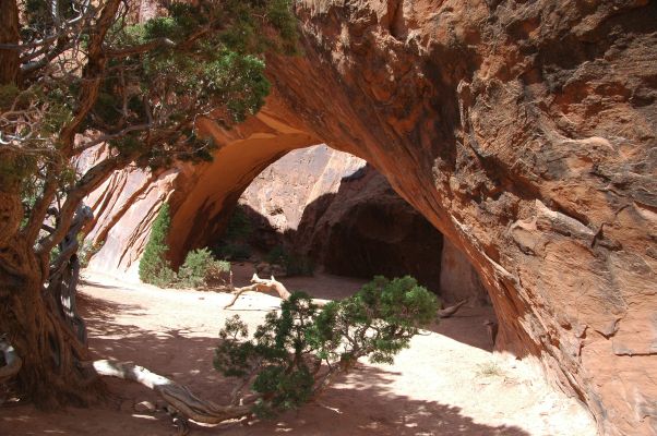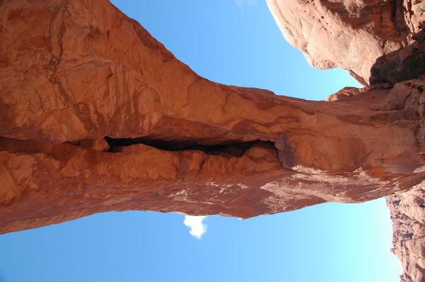 Der Arch ist nicht so spektakulär, aber einen Fussmarsch wert. Hier ruhen wir uns auch knappe 10 Minuten aus. Unsere Getränke sind zwischenzeitlich ekelig warm geworden. Zurück zum Plateau und dann laufen wir doch noch ein wenig Richtung Double O. Eine entgegenkommende deutscheTouristin berichtet von "in ca. 5 Minuten eine schöne Aussicht". Das wollen wir uns als Lohn der Kletterei dann doch ansehen