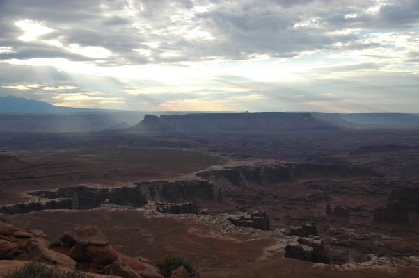 Am Grand View Point werden wir nicht enttäuscht. Die Sonne bestrahlt Needles in der Ferne und durchbricht strahlenweise die Wolkendecke über den Canyons.