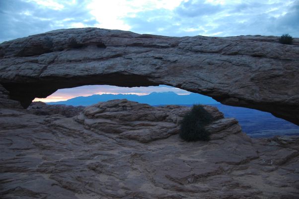 Unglaublich aber wahr - um 04:30 Uhr ist die Schlafenszeit vorbei. Husch, husch aus dem Körbchen! Binnen 60 Minuten sind wir geduscht, haben den Wagen beladen und dank der japanischen Reisegruppe auch ein kleines frühes Frühstück im Motel hinter uns. Wir checken aus ($315 für 3 Nächte). La Quinta war zwar sauber und auch in Ordnung, man findet sicher aber adäquates für weniger Geld. Der von uns nicht genutzte Pool ist klein, liegt zwar nicht an der Strasse, aber das Wasser ist auch ohne Gäste extrem trüb. Um 05:30 Uhr verlassen wir Moab bei bewölktem Himmel - wir hoffen dennoch auf einen Sonnenaufgang am Mesa Arch. Dort kommen wir dann knapp 38 Meilen später um 06:10 Uhr an und hechten den Trail zum Arch. Hier finden sich gerade mal 3 weitere Fotografen und der Himmel ist "awful". Eine morgendliches Glühen des Mesa Arch ist nicht drin