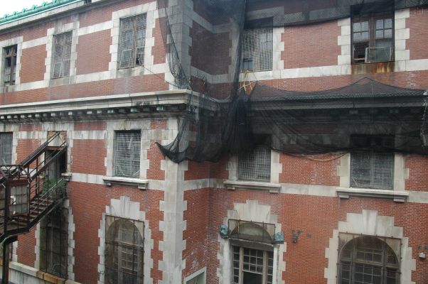 Beim Durchlaufen der Gallerieren fallen mir die mit einer Art Fliegengitter verhängten Fenster auf. Ich hebe sie mal leicht an und erhalte eine Blick hinter den renovierten Teil von Ellis Island