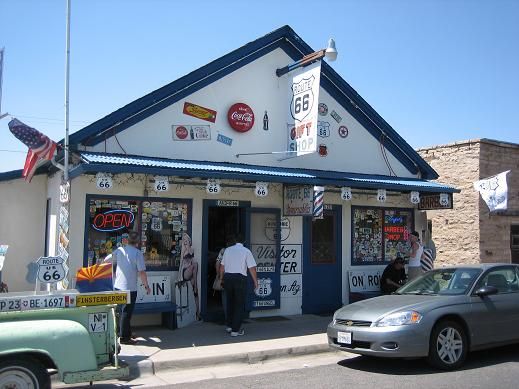 Nach Kingman passieren wir unzählige Orte, die so klein sind, dass man sie schnell übersieht. Aber schon bald kommen wir nach Seligman. Dem Kultort an der 66 schlechthin!