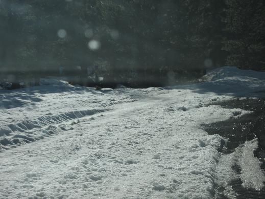 ! Wir drehen um und finden einen anderen Straßenabzweig, den wir zuvor übersehen haben. Diese Strecke bringt uns weiter und hin und wieder kommen uns sogar Autos entgegen. Nach einer Weile finden wir den ersten Schnee! Am Straßenrand liegen ganz kleine Mengen, nicht weiter schlimm. Doch plötzlich ist die Straße von einer dicken Schneeschicht überzogen: