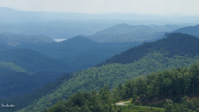 Der Turm hat natürlich keine Treppen, alles ist über Rampen einfach erreichbar –USA eben, kennen wir ja schon! Eine schöne Rundumsicht hat man aber dennoch über die Smoky Mountains. Die haben ja ihren Namen, weil die ständig aufsteigenden Nebelwolken wie Rauch aussehen und die sah man von hier besonders gut.