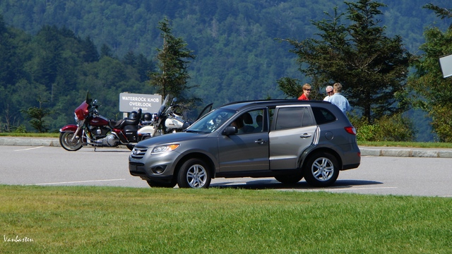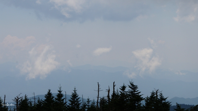 Später sind wir weiter gefahren durch die bergige Landschaft in die Smokey Mountains, zunächst auf den Clingmans Dome (etwas über 2000 m hoch). Auf dem Weg dorthin sah ich an einem Parkplatz einen Mann mit einer Kamera mit Teleobjektiv, der in die Gegenrichtung fotografieren wollte. Aus Neugier sah ich in den Rückspiegel und sah dort einen Schwarzbären, der aufrecht am Hang stand und „posierte“. Leider konnte ich dann nicht mehr anhalten denn hinter uns war Verkehr, also fuhren wir weiter.