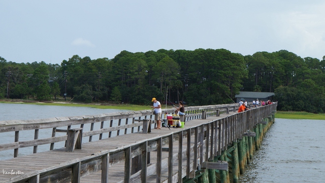 Der Abstecher zum Sea Island Strand sollte 15 Dollar pro Person kosten was uns für einen kurzen Besuch zu teuer war. Daher fuhren wir durch bis Hunting Island Statepark kurz vor die große Brücke, wo es ein Visitor Center und einen langen Steg gibt mit vielen Anglern –es war schließlich Sonntag!