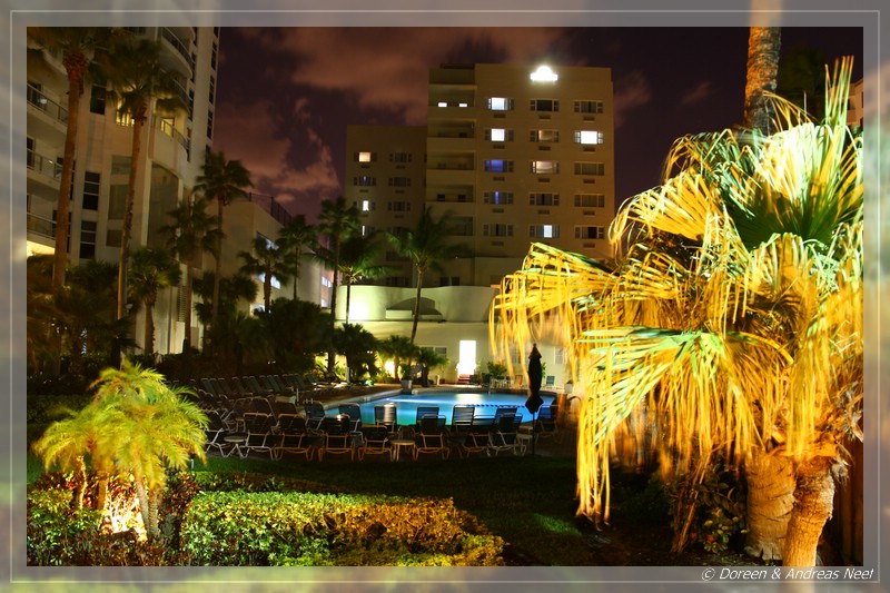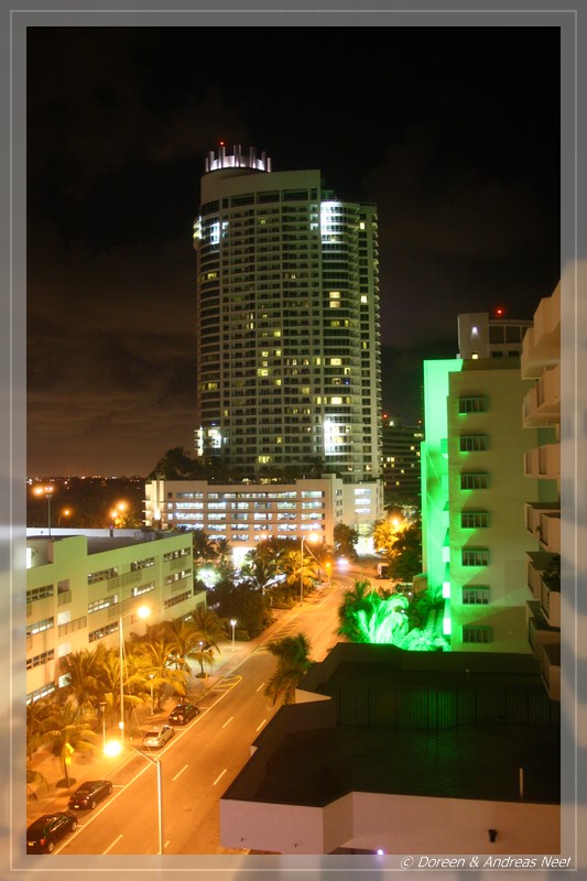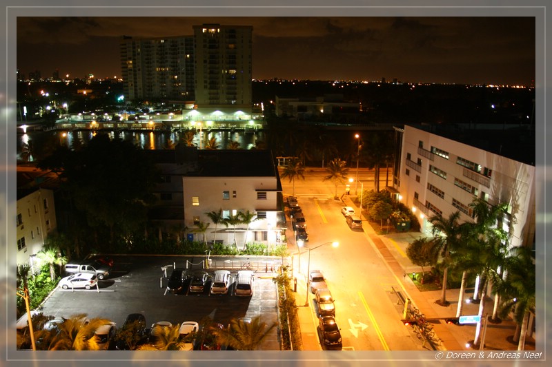 Zunächst lotste uns das Navi zum falschen Hotel, aber nach kurzer Korrektur erreichten wir schließlich das Days Inn Miami Beach/Oceanside. Dieses liegt zwar etwas weiter vom Ocean Drive und der Lincoln Road entfernt, wo das Nachtleben pulsiert. Dafür machte aber schon die Lobby einen recht noblen Eindruck, den das geräumige Zimmer später durchaus noch bestätigte. Andreas checkte an der Rezeption ein, während Doreen auf Parkplatzsuche einige Runden erfolglos um den Block drehte. Einen hoteleigenen Parkplatz gab es nicht, als Alternative zu eventuellen freien Plätzen in den Nebenstraßen wurde uns nur das kostenpflichtige Parkhaus gegenüber angeboten. Doch wir hatten Glück, nach dem Ausladen der Taschen wurde in der gegenüberliegenden Straße ein Platz an einer Parkuhr frei, die aber erst ab 8 Uhr Morgens gefüttert werden wollte.
