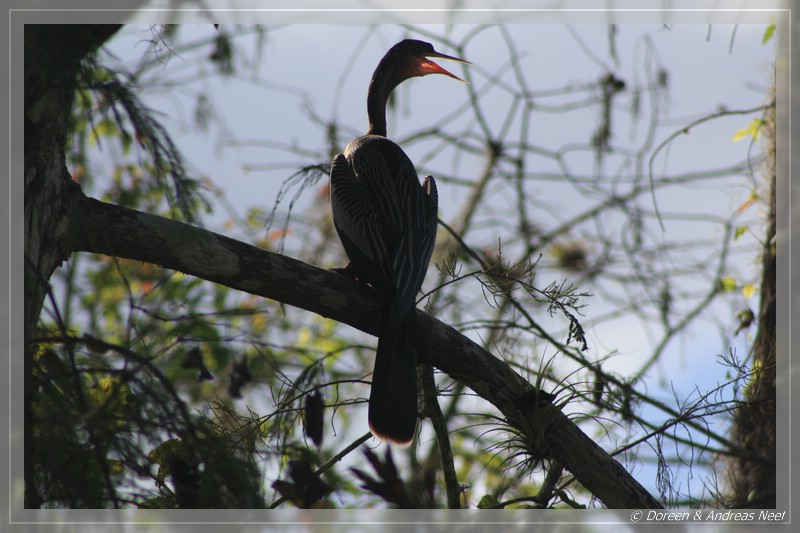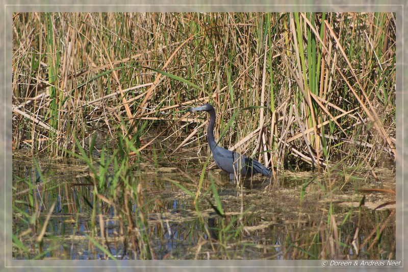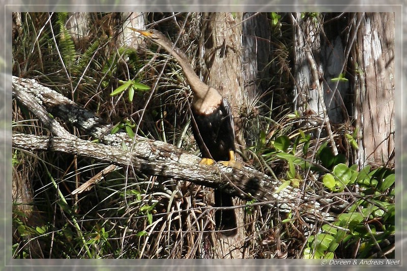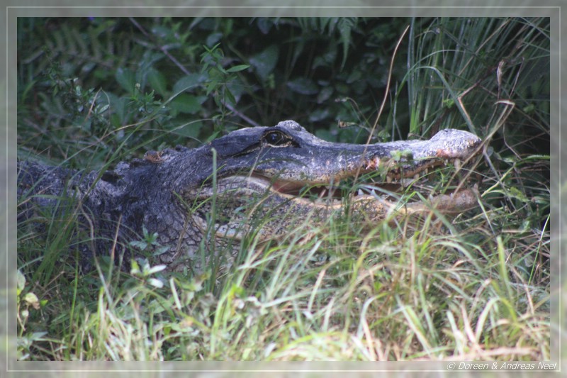Ein Stück vor uns fuhr ebenfalls ein Auto, dessen Insassen alle paar Meter ausstiegen und intensiv ins Unterholz starrten. Als wir sie eingeholt hatten, bedeuteten Sie uns, vorsichtig näher zu kommen und zeigten uns etwa ein halbes Dutzend Alligatorbabies, die nahe der Straße im Wasser schwammen. Ein paar Meter weiter hinten lag die Mutter regungslos zwischen den Bäumen und beobachtete mit Argusaugen jede unserer Bewegungen. Aus der Entfernung war ein vernünftiges Foto der durch Ihre farbliche Zeichnung ohnehin schon gut getarnten Jungen natürlich nicht möglich. Aber dennoch war das ein tolles Erlebnis. Auf der Weiterfahrt sahen wir immer wieder Alligatoren und Wasservögel, einer davon schien nur mit knapper Mühe einem Fressfeind entgangen zu sein. Zumindest sah sein Gefieder nicht mehr so ganz vollständig aus…