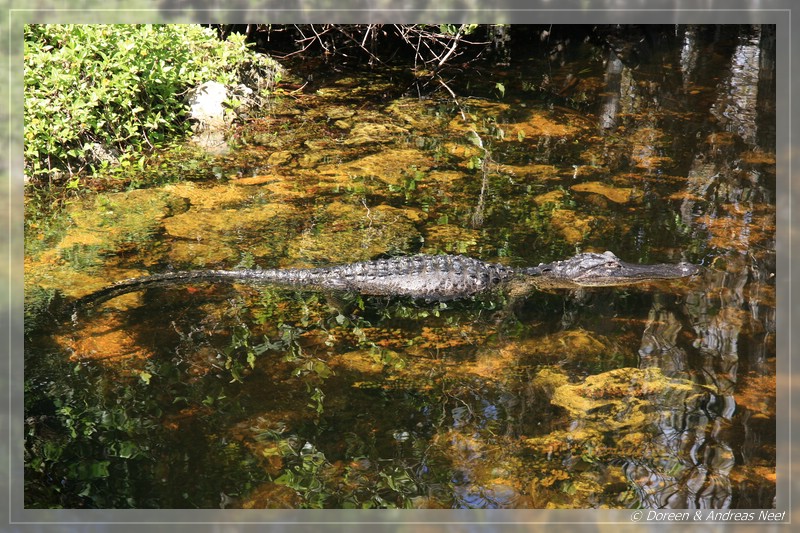 Und unsere Erwartungen wurden nicht enttäuscht: Immer wieder konnten wir größere und kleinere Alligatoren sehen. Mal nahe der Straße, mal versteckt in den Mangroven.