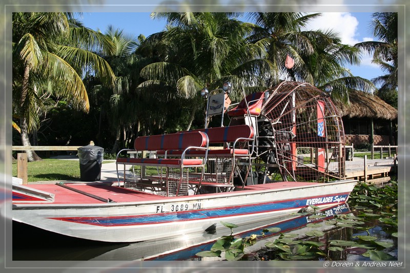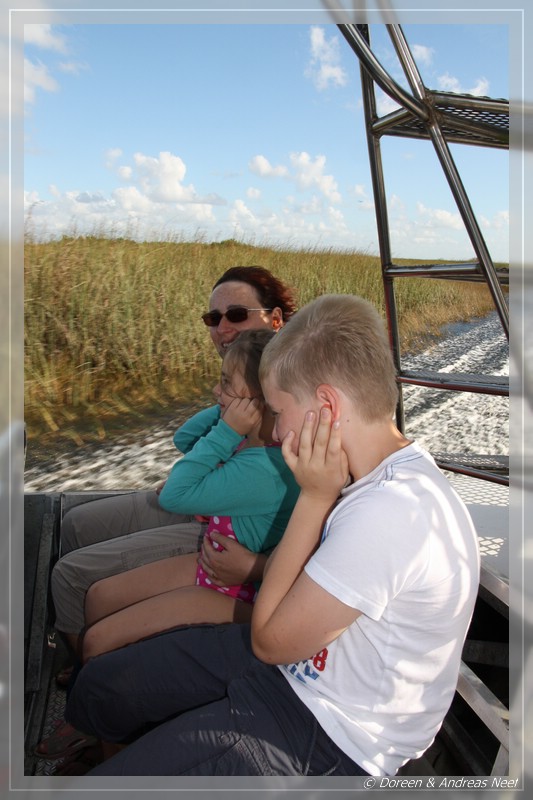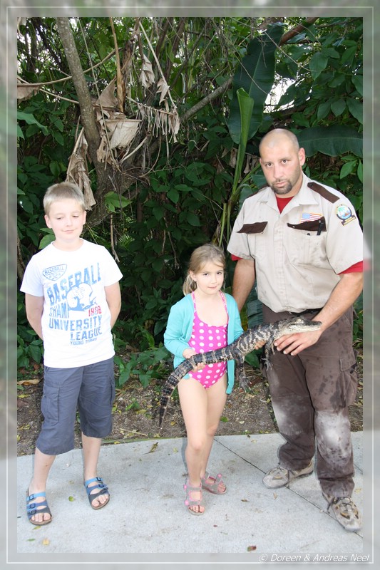 Irgendwann erreichten wir die Zivilisation wieder und bald darauf waren wir wieder auf dem Tamiami Trail. Am Eingang zum Shark Valley erhielten wir die Auskunft, dass es heute keine weiteren Touren mehr gäbe. Unseren Kindern war das sehr Recht, da sie noch immer ziemlich müde waren. Und auch wir waren in Sachen Alligator- und Wasservögelsichtungen eigentlich gesättigt. Was wir aber unbedingt noch machen wollten, war eine Airboat-Tour. Wir hatten auf der Hinfahrt bereits nach entsprechenden Anbietern Ausschau gehalten und steuerten deshalb nun zielgerichtet den Everglades Safari Park an. Dort sollte in wenigen Minuten die letzte Fahrt starten und so ließen wir uns nach einer kleinen Alligator-Show im Gehege des Parks mit dem Propellerboot durch die Mangroven schippern.