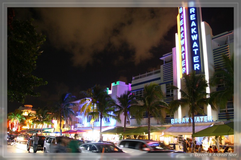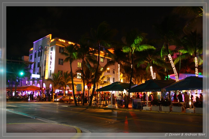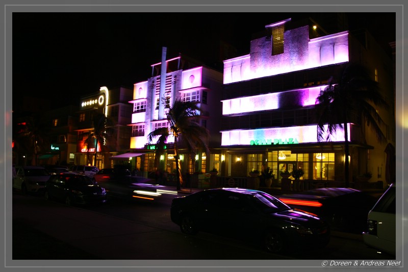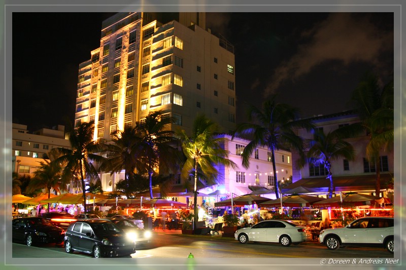 Anschließend liefen wir noch mal zum Ocean Drive. Einerseits wollten wir doch noch ein paar Nachtfotos vom Art Deco Viertel machen, andererseits sollte es am letzten Abend noch einen schönen Abschiedscocktail bei Fat Tuesdays geben. Hier, wo sich sonst am Abend alles trifft, was sehen oder gesehen werden will, war es heute deutlich ruhiger. Die große Party fand eben auf der Lincoln Road statt. Dennoch gab es natürlich auch hier etwas fürs Auge und die wirklich coolen Typen cruisten in ihren aufgemotzten Fahrzeugen auf und ab…