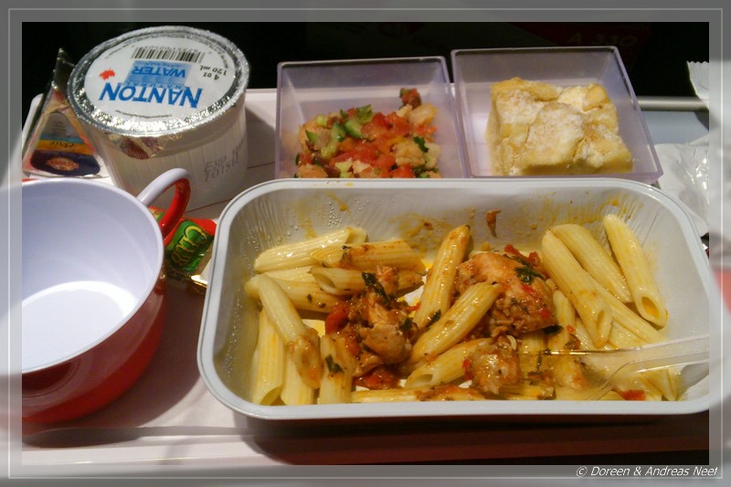 Über Transportbänder und Fahrstühle errichten wir nach einer gefühlten Ewigkeit den Checkin-Schalter, wo wir dank Doreens perfekter Vorarbeit unser Gepäck im Handumdrehen loswerden. Nun hatten wir noch fast drei Stunden bis zum Boarding. Wir suchten uns einen Platz mit schönem Ausblick aufs Rollfeld und Andreas las mit den Kindern noch eine Geschichte aus einem von Vincents Büchern. Etwa nach der Hälfte der Zeit wechselten wir in den Abflugbereich, bummelten dort noch etwas durch die Shops und warteten auf den Beginn des Boardings. Das ging dann recht zügig vonstatten, wir hatten wie auch schon auf dem Hinflug eine komplette Viererreihe in der Mitte und auch das Filmangebot war noch das gleiche. Andreas schaut „Walkt he line“, eine Magnum-Folge im englischen Original (irgendwie passt Tom Selecks richtige Stimme gar nicht so ihm…) und versucht etwas zu schlafen. Letzteres aber mit sehr mäßigem Erfolg. Das Flugzeugessen war wieder das übliche (Chicken od Pasta), nicht ganz so toll wie auf dem Hinflug, aber dennoch recht genießbar.
