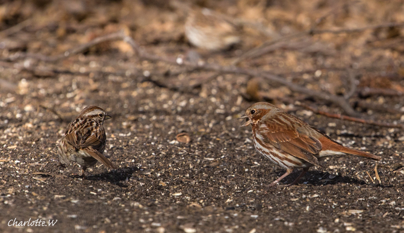 Hier im Zwiegespräch mit einem Song Sparrow und man sieht gut, wie groß der Fox Sparrow ist.