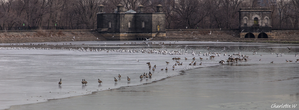 Auch wenn es mir wirklich schwer fällt, wir müssen uns irgendwann doch von den Rambles trennen, wenn wir den Rest des Parks noch erkunden wollen. Dass man das Reservoir nur in eine Richtung umrunden darf, hab ich vergessen, dabei hatte unsere Greeterin uns das letzte Woche doch gesagt. Während meine Freundin auf mich wartet, laufe ich kurz in die "richtige" Richtung, um ein Bild vom noch halb gefrorenen See und den Wasservögel darauf zu machen. Dabei sehe ich die Schilder und mir geht ein Licht auf. Wir müssen also irgendwie anders laufen, wenn wir nicht ganz außenherum wollen. Aber erstmal mache ich die Bilder.
