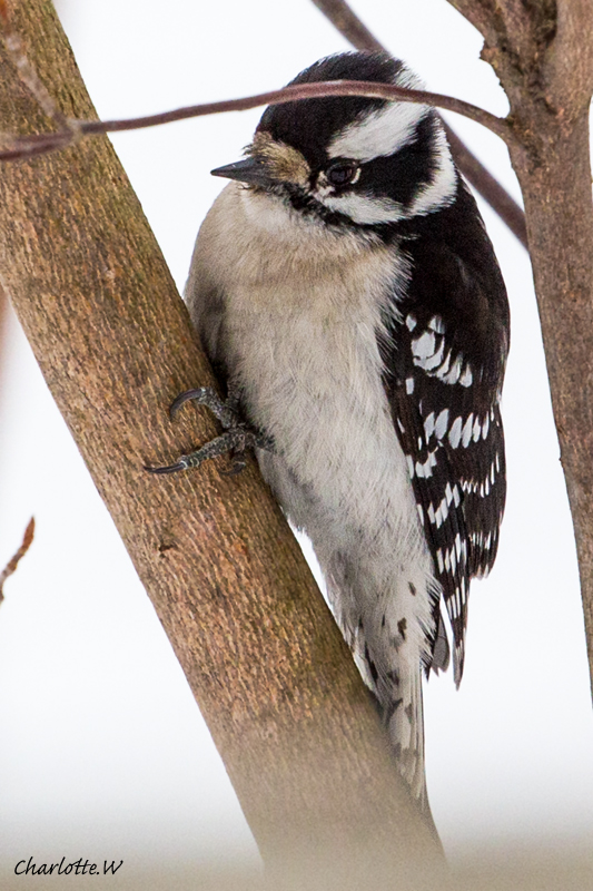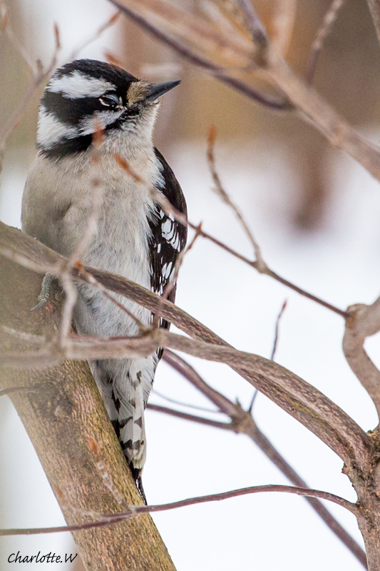 Während ich noch so dabei bin die Vögel auf der Bank zu fotografieren, kommt auch der hübsche Specht wieder vorbei, gleichzeitig sehe ich aber hinter ihm im Gebüsch eine Bewegung. Und tatsächlich, es ist ein Vogel, den ich noch nicht brauchbar auf meine Platine gebannt habe. Ein Downy Woodpecker!
