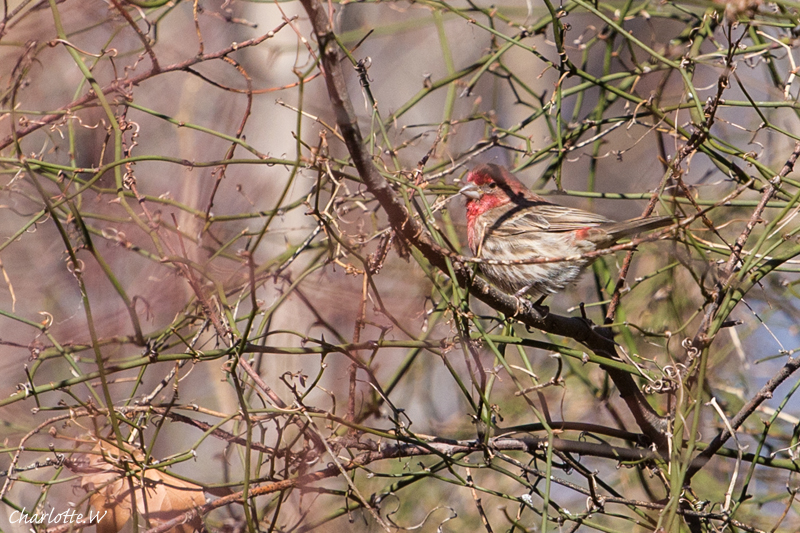 Weiter führt uns nun Bob durch den Park. Oft macht er die Geräusche von Vögeln nach oder lockt sie mit einem Schuhhhh Schuhhhh aus ihren Verstecken. An einer Wiese auf einem Strauch sehen wir einen House Finch
