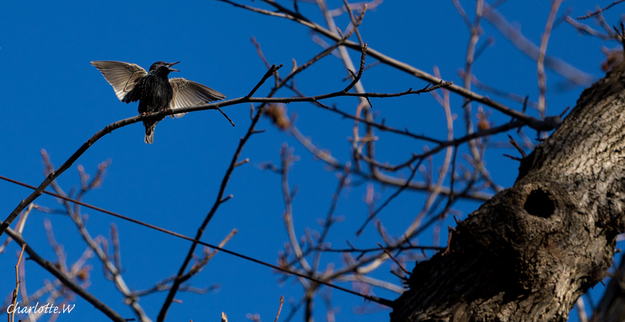 Im Baum neben mir, sehe ich einen Star in ein Baumloch fliegen. Ich zücke die Kamera und mache Bilder. Der Star sitzt auf dem Ast neben seinem Brutloch und lässt die ganze Welt wissen, was für eine tolle Brüthöhle er da hat.