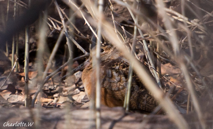 Der Birdwalk ist lustig …. für Bob sind wir die German Ladys und er weißt uns sogar auf einen Robin hin … aber die haben wir jetzt ja auch schon zur Genüge gesehen. Ich sage ihm, dass ich gerne ein Bild von einer Titmouse machen würde … er spricht zwar viel und sagt immer zu einem Teenager namens Xander, dass er eine Titmouse auf der Hand mit Samen anfüttern soll …. aber irgendwie klappt das erstmal nicht. Dafür gibt es aber ein echtes Highlight. Einer der Leute auf der Birdtour hat in den Rambles einen Woodcock (Waldschnepfe) entdeckt. Die Waldschnepfen ziehen im Moment hier durch. Sie sind so perfekt getarnt, dass man sie im Laub und am Boden fast nicht sieht. Tagsüber bewegen sie sich nämlich kaum. Aktiv werden sie erst am Abend. Und so braucht es wirklich gute Augen oder etwas Glück, dass die Sonne sie anstrahlt, um sie am Tag im Unterholz zu entdecken. Der Mann führt uns zu dem Glände, wo er die Waldschnepfe entdeckt hat. Da hinten soll der Woodcock sitzen. Ich starre auf das Gewirr aus Zweigen und Blättern. Einen Vogel sehe ich aber nicht. Eine nette Frau erklärt es mir bis ins Detail und ja .... es könnte sein, dass da was ist. Ich mache ein Bild und zoome auf meiner Kamera das Bild heran und tatsächlich - da sitzt eine Waldschnepfe perfekt getarnt auf dem Boden. Das Suchbild kennt ihr ja schon. Hier nun der Zoom!
