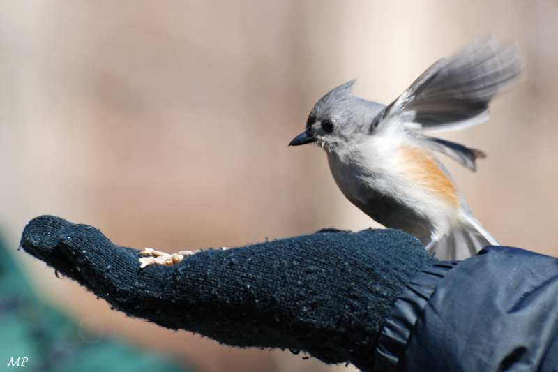 Aber nicht nur ich habe Glück damit, als wir bei einem Vogelhäuschen mit Futter ankommen, gelingt es Xander dann doch, eine Titmouse von der Hand zu füttern. Meiner Freundin gelingt davon ein schönes Bild.