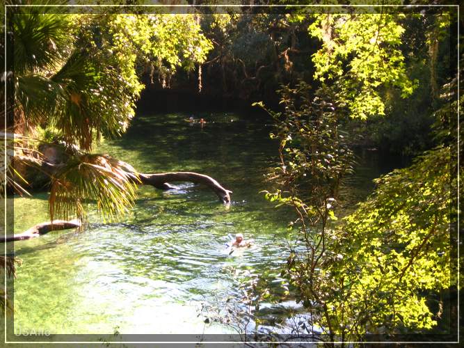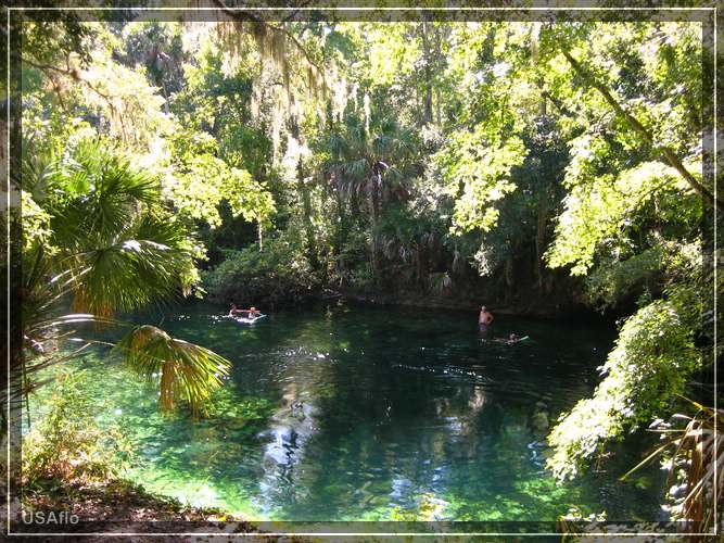 Wir gingen bis zum hinteren Einstiegsbereich und schwammen ebenfalls im glasklaren Wasser (naja unserem Sohn war es zu kalt, er blieb lieber auf der Treppe stehen). Es war gar nicht so leicht gegen die Strömung zu schwimmen, da aus der Quelle täglich 104 Millionen Gallonen Wasser strömen.