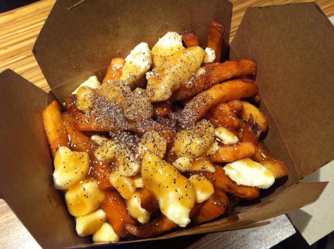 Poutine: eine Spezialität in Quebec. Labbrige Pommes, eine Art Barbecue-Soße, Hühnchen und Käse... ziemlich ungenießbar, aber muss man mal probiert haben.