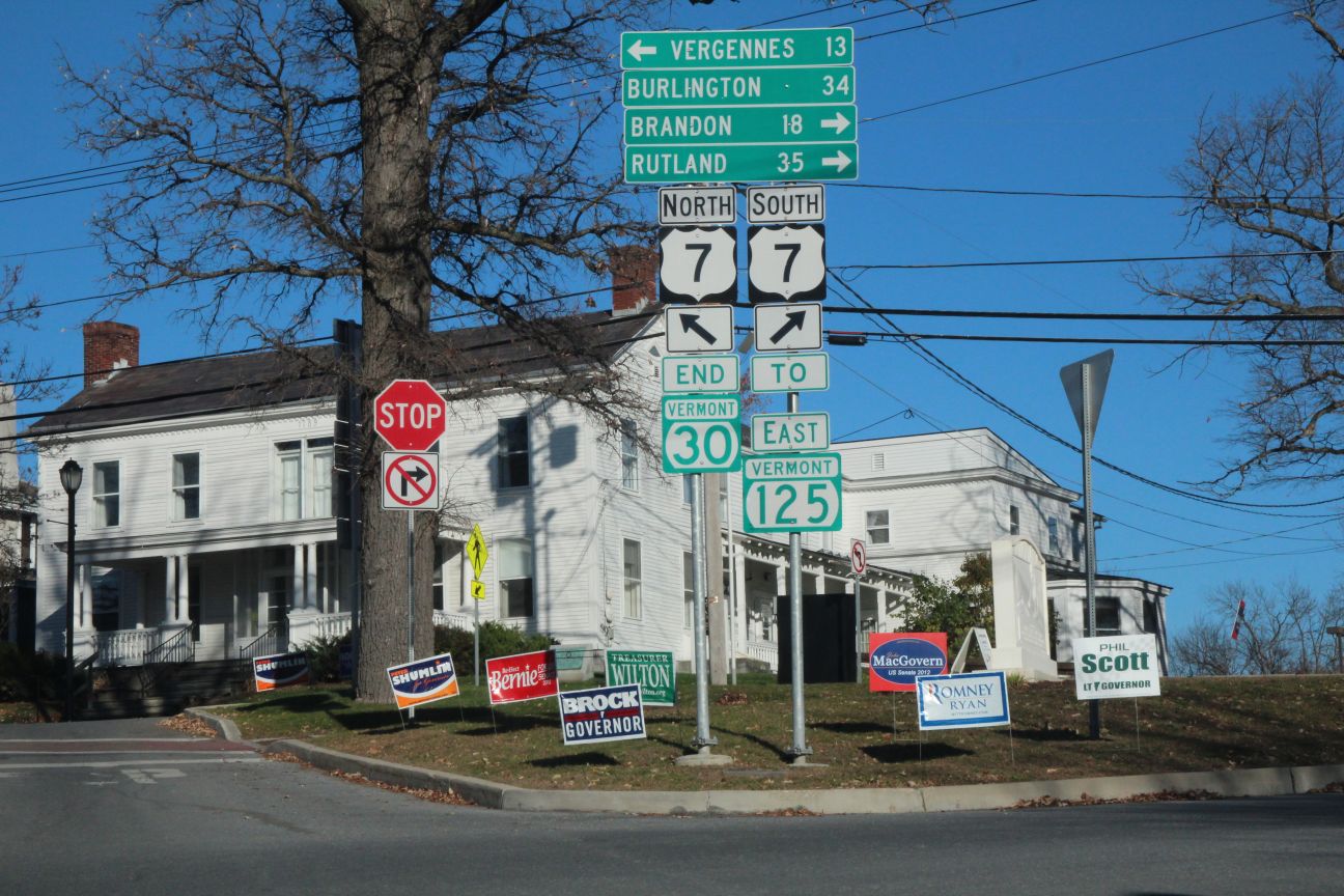 Am Wahltag in Middlebury: Alles voller Plakate... last-minute Wahlwerbung
