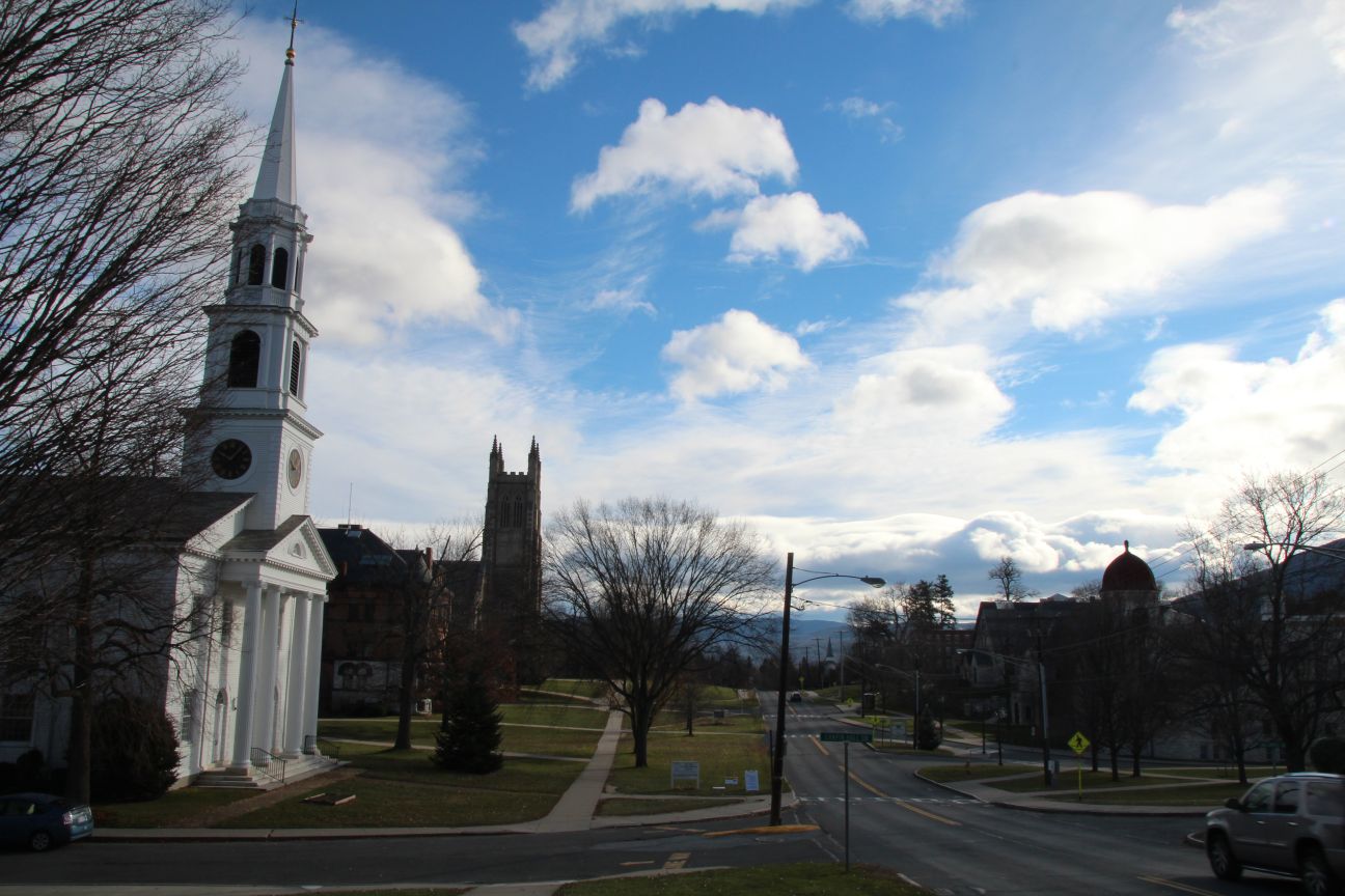 Die Landschaft hier fiel uns sofort als wunderschön auf: auf beiden Seiten der Stadt konnte man Bergketten sehen – wie ich heute weiß, auf der Westseite die Silhouette der Adirondacks, auf der Ostseite die Green Mountains. Wir fuhren an meinem zukünftigen Wohnheim vorbei, schauten uns vom Hügel jenseits des College den Sonnenuntergang an und aßen Abendbrot im Restaurant 51 Main.