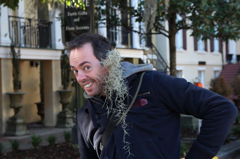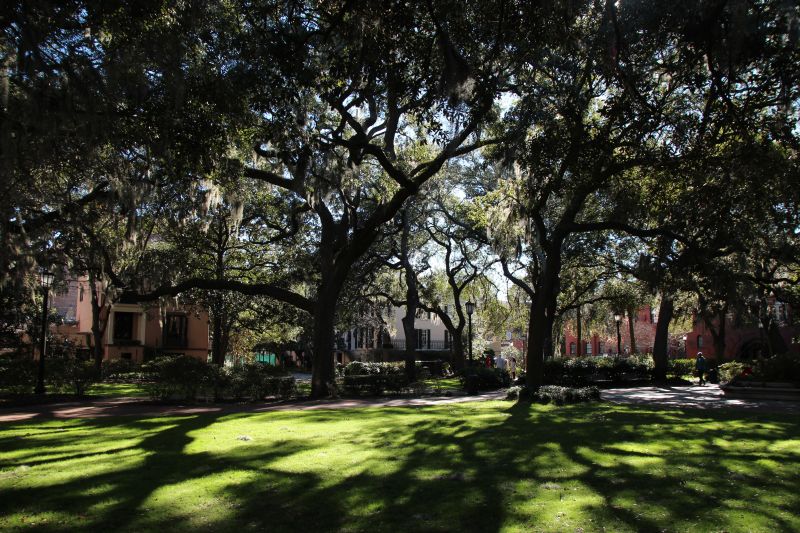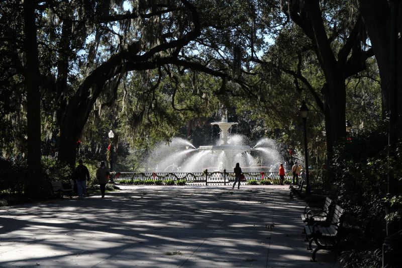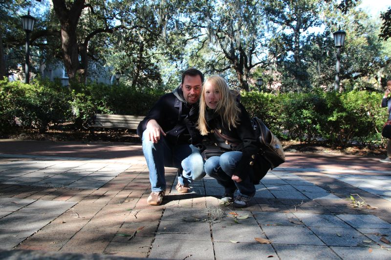 Wir parkten am Fluss und ließen uns dann bei Panera auf der Hauptstraße zum Frühstück nieder, wo ich eine Art Käsesouffleé hatte und Heiko ein Stück Kuchen, während wir die warmen Getränke und den warmen Raum genossen.   :fire: Als nächstes liefen wir dann einfach viele der Squares ab, genossen die belaubten Bäume und die tolle Atmosphäre mit der herrlichen, prunkvollen Südstaatenarchitektur, spielten mit dem Moos von den Bäumen (worauf uns gleich ein netter Junge, Straßenmusiker, ansprach und mit uns etwas darüber quatsche, wo wir herkommen usw.) und erreichten dann irgendwann einen größeren Park mit einer schönen weißen Fontäne.