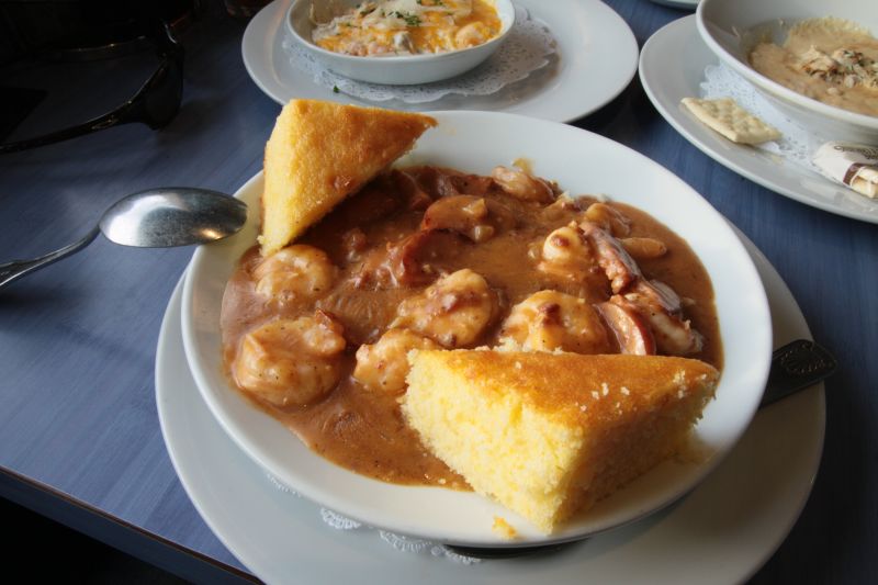 Wir warfen noch einen Blick auf ein riesiges Kreuzfahrtschiff, was im Hafen lag, bekamen dann aber einen Riesenhunger, so dass wir in der „Noisy Oyster“ einkehrten, um typisches Südstaatenessen zu probieren. Oder genauer „Lowcountry Food“, benannt nach der Küstenregion – da gibt es natürlich viele Meeresfrüchte. Wir saßen an der frischen Luft, tranken übel süßen Eistee und bestellten uns Nachos mit einem Dip aus Krabben- und Garnelenpüree; Krabbensuppe mit Meerrettich („She Crab Soup“) und Crackern, die aus einem gestürzten Kreis aus Krabbenfleisch und Creme außenherum bestand; und schließlich noch „Shrimp’n’Grits“, Matsch-Reis, darüber eine dicke, cremige und leicht seltsam schmeckende Soße mit Garnelen und Würstchenstücken, dazu Grits – im Grunde Kuchenstückchen aus Maisteig. Sehr seltsame Kombination.  :essen:  Das Essen schmeckte hervorragend, aber danach hatten wir dann auch genug Meeresfrüchte.