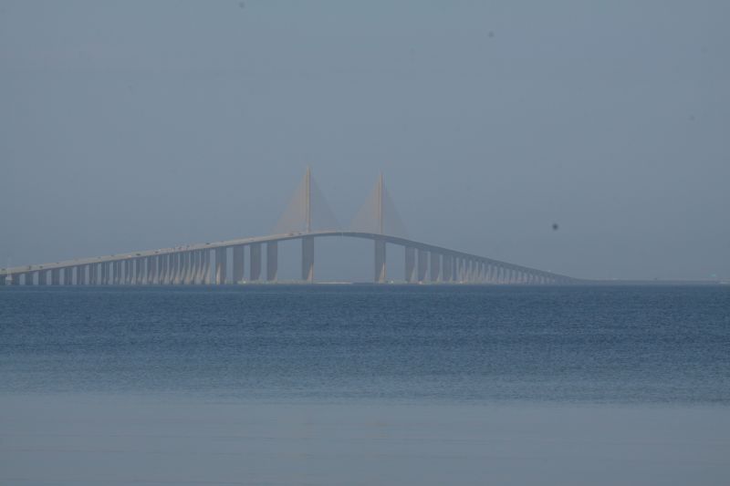 Wir standen morgens früh auf, frühstückten, packten und checkten aus und machten uns auf den Weg. Wir ignorierten Sarasota und die (sicher sehr schönen) Strände vor der Küste von Sarasota, da wir schon genug Strände gesehen hatten und heute noch bis Orlando kommen wollten. An der Küste entlang fuhren wir dann Richtung St. Petersburg (nein, nicht nach Russland  :lol: ) und hielten als erstes beim Sunshine Skyway an, einer großen Brücke. St Petersburg und Tampa, zwei große Städte in Florida, liegen beide an einer Bucht und sind über zahlreiche Brücken miteinander verbunden. Eine dieser Brücken ist der 4 Meilen lange Sunshine Skyway, der erstmals 1954 erbaut wurde, im Jahre 1980 dann aber nach einer Kollision mit einem Schiff einstürzte und 1987 wieder erbaut wurde. Wieder einmal hatten wir herrliches Sonnenwetter und hielten an einem Parkplatz an, wo wir einen guten Ausblick auf die schöne Brücke hatten.