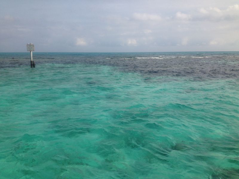 Schließlich brachten wir noch unsere Wertsachen ins Auto und stellten uns dann an, um aufs Boot zu gehen. Das Boot war ein quadratisch-praktisch-gutes Boot mit einem Geländer drumherum, einem Planendach und Sitzbänken, auf denen wir uns niederließen. Der Käpt’n wies uns ein und erzählte uns über Notfälle und Seekrankheiten und dann ging es schon los. Wir fuhren fünf Meilen aufs offene Meer hinaus, wozu wir zunächst durch immer weiter werdende Mangroven-Wasserstraßen fuhren, bis wir dann die Küste komplett hinter uns ließen. Auf dem offenen Wasser wurde es dann sofort windig und, die Wellen waren schon höher und jetzt gab der Kapitän richtig Gas, so dass wir über das türkisblaue Wasser hinwegschossen. Nach einer halben Stunde waren wir dann am Riff, setzten den Anker, legten alle unsere Ausrüstung an und hüpften einer nach dem anderen ins Wasser. Die Bedingungen waren übrigens ideal, denn es war nur schwach windig, die Sichtbarkeit unter Wasser betrug fast 8 m und die Sonne schien, was natürlich die Korallen noch mal besonders erstrahlen lässt. Der Kapitän gab noch letzte Anweisungen, in welchem Gebiet wir schwimmen dürfen, und dass wir die Portugiesischen Galeeren vermeiden sollen, die ab und zu mal hier rumschwimmen, und dann ging es los.   :lachen5: