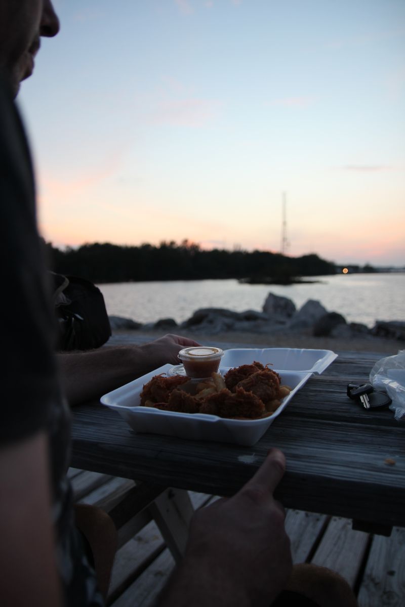 Wir nahmen uns Essen „to go“ mit (das wir bei einem urigen, zahnlosen Fischer bestellten) und setzten uns auf eine der Picknickbänke an der Marina, so dass wir bei Sonnenuntergangsstimmung unsere Garnelen in Kokosnusspanade und „Lobster Reuben Sandwich“ (sehr seltsam, aber unglaublich lecker: Hummerstücke mit Sauerkraut und einer Cocktailsoße zwischen Baguettebrotscheiben… so gut!) genossen.  :essen: