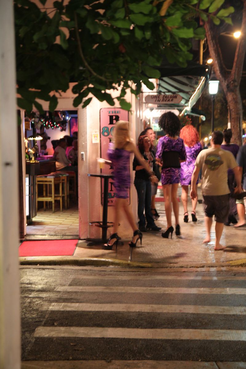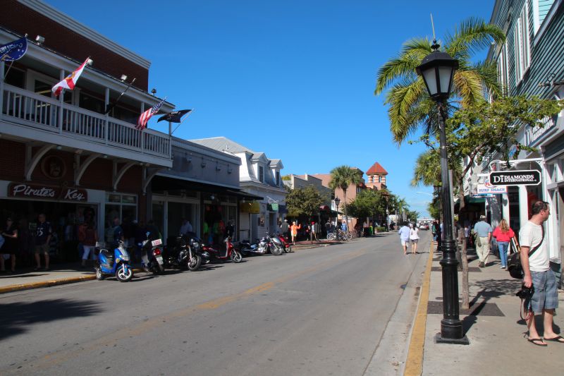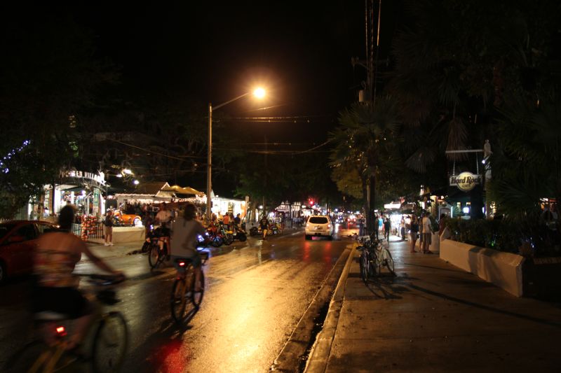 Im Stockfinsteren fuhren wir dann bis nach Key West, und viel Interessantes gab es nicht zu sehen, bis auf das ganze Wasser links und rechts, was auf dem Navi zu sehen war. Außerdem fragten wir uns, ob Key West wirklich so viele Menschen beherbergen kann wie in der Autokarawane hinzufahren schienen. Angekommen auf Key West sahen wir als erstes halbnackte Jungs mit einer Schubkarre – ok  :think:  :lol: – und erreichten dann unser hübsches Motel. Wir machten uns schick und stürzten uns dann noch ins Nachtleben von Key West. Draußen war es sehr tropisch und feucht und regnete immer mal ein paar Tropfen; nach einer ganzen Weile erreichten wir dann die „berühmte“ Duval Street (einer der wenigen Orte in Amerika, wo offener, sichtbarer Alkohol auf der Straße erlaubt ist, oder zumindest geduldet wird). Zuerst sah die Straße sehr verschlafen aus, je weiter wir dann jedoch ins Zentrum liefen, desto bunter wurde das Treiben.