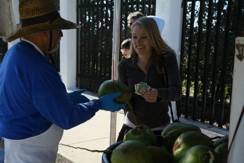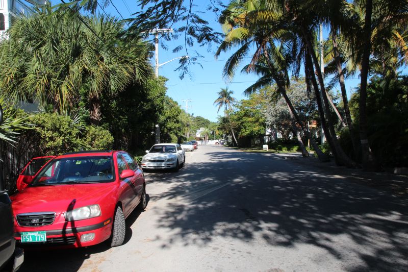 Rechts von uns stand ein Typ, der frisch angebohrte Kokosnüsse zum daraus trinken verkaufte, und um ihn herum liefen auf der Straße Hühner herum. Die sollen hier auf Key West sehr üblich sein, diese Straßenhühner, und gaben der Insel einen "karibisch-heruntergekommenes" Flair.  :lol:  Wir kauften eine sehr leckere Kokosnuss und zutschten den süßen, erfrischenden Saft aus ihr heraus. Dabei spazierten wir durch die Straßen und erreichten dann wieder das Auto.