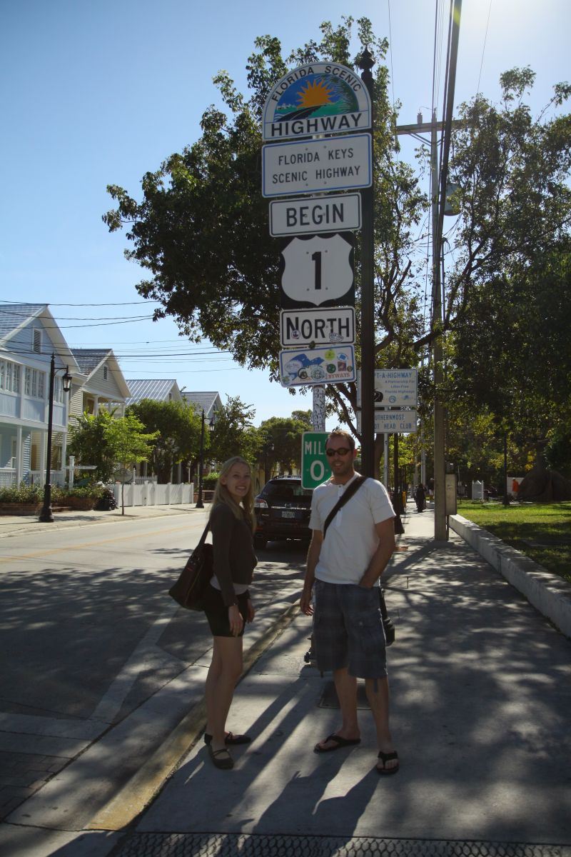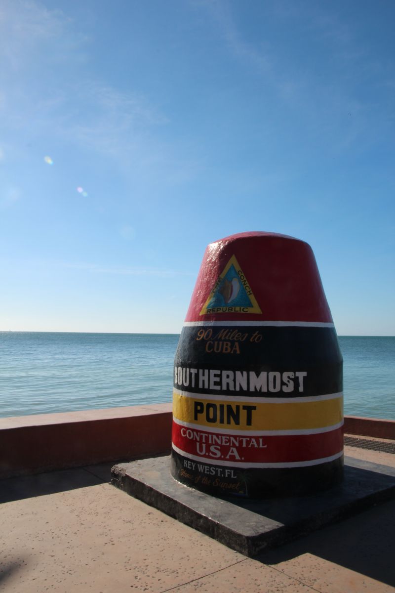 Wir fuhren als nächstes parallel zur Duval Street Richtung Malloy Square (wo immer das Sonnenuntergangsspektakel ist), vorbei am Haus von Ernest Hemingway. Wir sparten uns jedoch die 14 Dollar Eintritt und die lange Warteschlange, auch wenn Fredi schon gerne die vielen Katzen von ihm gesehen hätte, die alle einen Zeh zuviel hatten. Wir parkten dann in der Nähe des „Milemarker 0“ und machten Fotos von uns und dem Marker. Dieser Marker ist nämlich deshalb so besonders, weil er den Anfang und Ende des Highway 1 darstellt, der über 3800 km an der Ostküste der USA entlangführt, von Maine bis nach Florida.