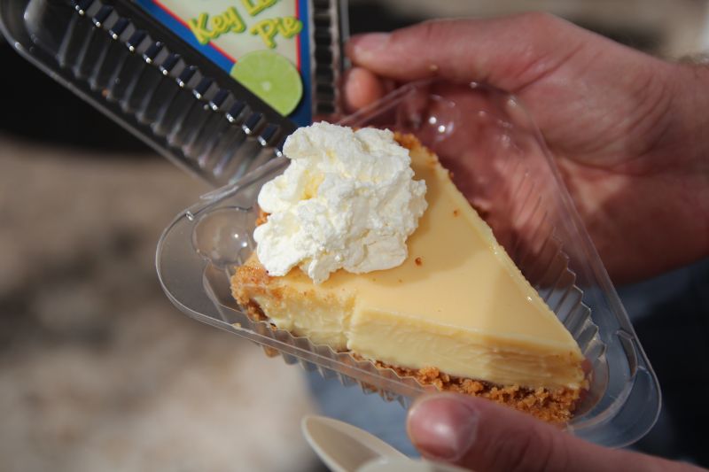 Wir liefen auch zum Malloy Square, wo wir uns ein paar Minuten hinsetzten und die Touristen und das Meer beobachteten. Gerade war nicht so viel los, aber zu Sonnenuntergang soll hier richtig die Post abgehen, schade dass wir das verpasst hatten.  :( Es war heute ganz schön kühl und windig, und so flüchteten wir schnell wieder in die Duval Street, wo wir noch ein paar Souvenirshops abklapperten und Postkarten und Mitbringsel für zu Hause kauften. Außerdem probierten wir ein Stück „Key Lime Pie“, ein Kuchen der aus Key Lime hergestellt wird – das sind Minilimetten in Aprikosengröße. Der Kuchen hatte einen Boden aus süßem Teig und dann einer leicht säuerlichen Creme darüber, mit Schlagsahne drauf; eine sehr leckere Kombination.  :daumen: