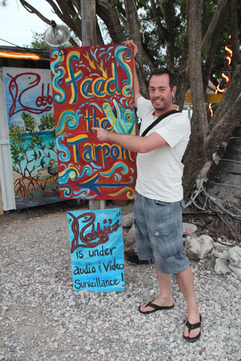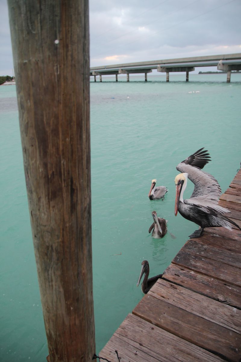 Leider neigte sich der Tag auch schon langsam wieder dem Ende entgegen und so hielten wir nur noch bei Robbies Marina auf Islamorada an, wo man ein paar verrückte Touristenstände mit Kunst, Ramsch, Angelzubehör und Sonnenbrillen finden konnte. Aber deswegen waren wir nicht da; für 3 Dollar konnte man einen Eimer voller Fische kaufen, die man dann an die gigantischen Tarpune in Robbies Marina verfüttern durfte (wenn sie einem nicht von den Pelikanen aus der Hand geschnappt wurden).