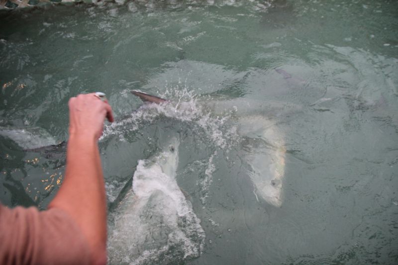 Heiko legte sich mutig auf den Steg und hielt seine Hand über die Wasseroberfläche, einen Fisch zwischen den Fingern, und wartete darauf, dass er ihm von einem Tarpun weggeschnappt wurde, was auch nicht lange dauerte: Plöhötzlich sprang ihm ein Monstertarpun entgegen und wollte ihm die ganze Hand abbeißen, aber Heiko zog sie natürlich rechtzeitig (heldenhaft) weg.  :wink: Aufregend!  :zuberge: :lol:
